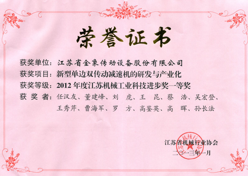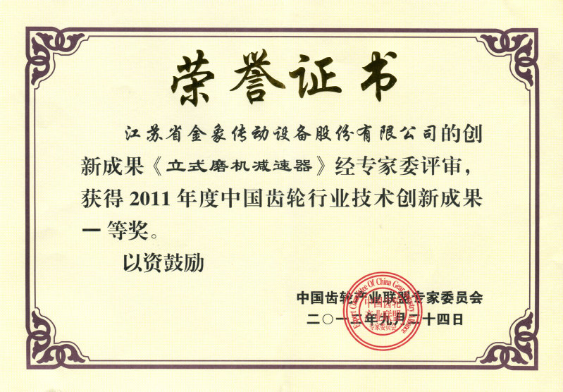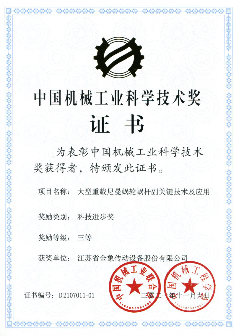 公司獲得多項行業或省級獎項:公司研發的“大型重載尼曼蝸輪蝸桿副關鍵技術及應用”獲批2021年度中國機械工業科技進步三等獎,“多分流立式磨機傳動裝置”獲批江蘇省專精特新產品,新型立式磨機減速器的研發與產業化獲得中國機械工業科學技術獎三等獎;新型單邊雙傳動減速機的研發與產業化獲2012年度江蘇機械工業科技進步一等獎;CWG系列雙級蝸輪齒輪減速器、立式磨機減速器被授予中國齒輪行業技術創新成果一等獎。