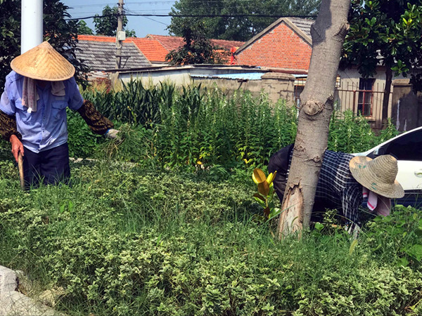 持續的高溫,下午二點的室外溫度達到38度左右,但在三河場部主干道兩側的綠化島內,環衛工人們仍然二點準時到崗,由于夏季雜草生長極快,綠化島內的雜草已經爬上了島內的觀光苗木,為了不影響美感,大家便利用清掃馬路之余時間,對島內的雜草進行人工拔除。8月10日下午二點十分,筆者在農場醫院門前的綠化島內看到,環衛工人們手戴著手套,戴著草帽,由于天氣太熱,大家都沒有戴口罩,而是每人的脖子上圍著條毛巾用于擦拭不停從臉上的汗水,衣服已經被汗水浸濕透了,但大家仍然認真細致的在拔除每一棵雜草,并不時的回頭看有沒有遺漏的。當筆者問他們為什么不避開高溫拔除時,一位環衛工人擦擦臉上的汗說,早晚涼時間他們還要清掃馬路,時間再不抓緊點,草越長越高就難看了,爭取兩天時間把兩邊島內的草都拔干凈,這就是三河環衛工人的情懷,不言苦,不說累,用汗水描繪著三河的每一寸美麗畫圈。