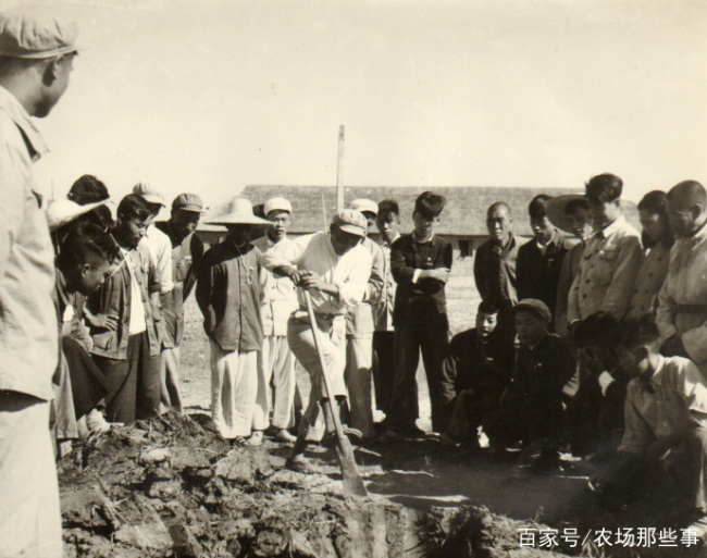 正因為江希友發明的“‘江大鍬’挖土法”在全農建四師的成功推廣和在水利戰役中的優良表現,1953年3月17日,他被農建四師表彰為"特等功臣"。并成為淮海農場建場60周年的10大知名人物。圖一是江希友在水利工地作挖溝示范。