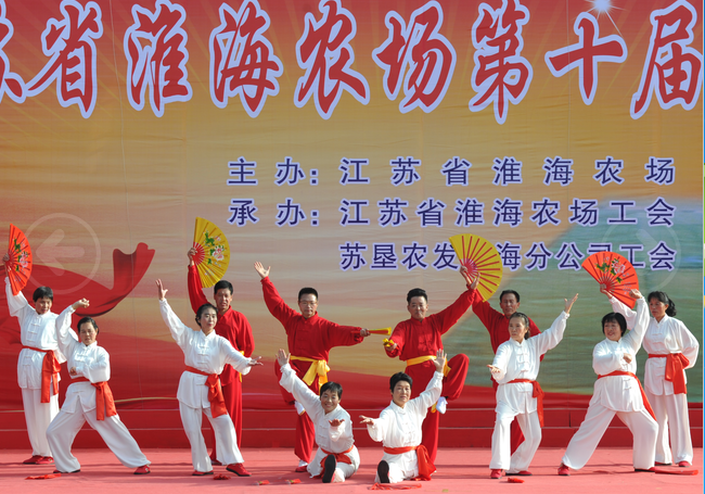 為了提高大家練拳的興趣,淮海晨練點(diǎn)的負(fù)責(zé)人胡建軍還帶領(lǐng)拳友到鄰近的鄉(xiāng)鎮(zhèn)進(jìn)行走訪交流,互相表演,切磋拳藝。并經(jīng)常組織拳友一起到濱海港風(fēng)景區(qū)、荷蘭花海風(fēng)景區(qū)、愛蓮苑水生花卉等處游玩,讓大家體會到通過團(tuán)隊(duì)的形式和練太極拳給自己的身體帶來的健康和怡悅。圖為農(nóng)場太極隊(duì)部分隊(duì)員在農(nóng)場文化廣場上晨練時(shí)的鏡頭。