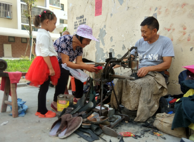 “葛師傅,我家孫女的鞋子破了,能否請你現在就弄,我還有急事。”9月22日下午,筆者看到有一位婦女用自行車拖著一個小女孩來到了葛華的修鞋攤前說。