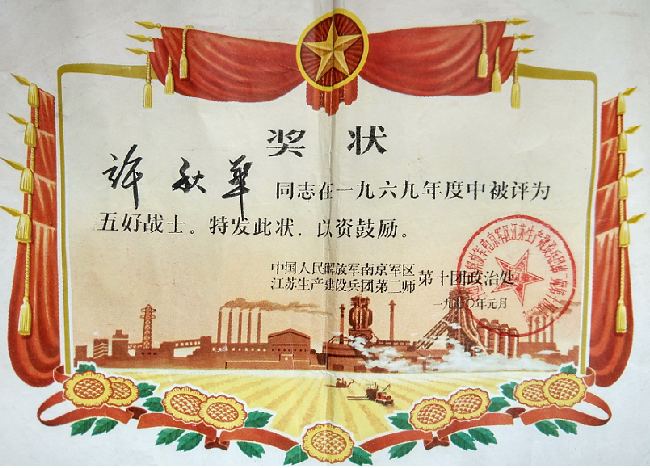 “聽(tīng)說(shuō)淮海籌建的農(nóng)建四師暨淮海農(nóng)場(chǎng)歷史陳列館有知青這方面的資料館,我特地把這份珍藏已久的上山下鄉(xiāng)期間獲得的獎(jiǎng)狀和致家長(zhǎng)同志們的一封信捐獻(xiàn)給陳列館,讓大家一起銘記那個(gè)年代崢嶸的革命歲月!”近日,無(wú)錫知青許秋華特地請(qǐng)人把獎(jiǎng)狀和印有最高指示的一封信請(qǐng)人轉(zhuǎn)交給了農(nóng)建四師二期工程建設(shè)陳列館的工作人員手中,望著這頗有歷史厚重感的實(shí)物,好似令人重新回到了那段難忘的歲月。