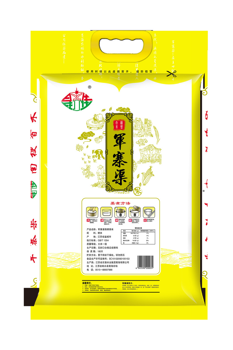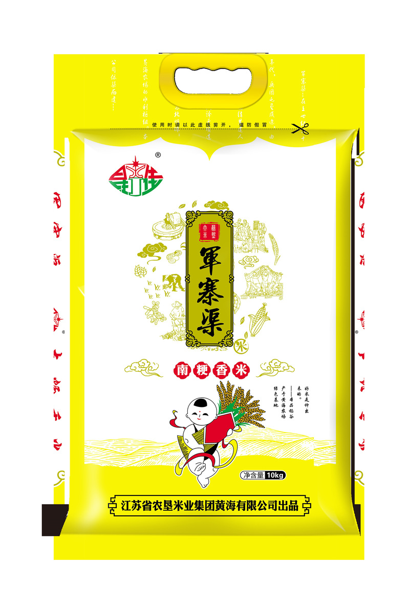 “軍寨渠”商標于2018年注冊,商品使用類別為第30、31類。圖案里的水果造型寓意“農副產品”;“綠色”寓意與健康同伴相融,生生不息;“軍寨渠”是黃海農場母親河,一直哺育著農場遼闊的土地。上世紀60年代末開挖軍寨渠時,農場職工和知青幾乎都參與到工程建設中,留下了關于軍寨渠建設的深刻記憶。以此為商標,也是紀念黃海這段“墾荒史”,傳承墾荒文化。