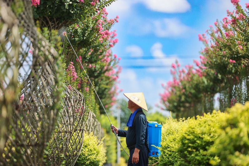 8月14日,江蘇省鹽城市射陽縣,在江蘇農(nóng)墾新洋農(nóng)場容器苗項目基地,管理人員正在為紫薇花瓶噴施藥物防病治蟲。據(jù)悉,新洋農(nóng)場建成配有水肥一體、智能控制等設(shè)備的容器苗圃200畝。張偉生攝(中經(jīng)視覺)