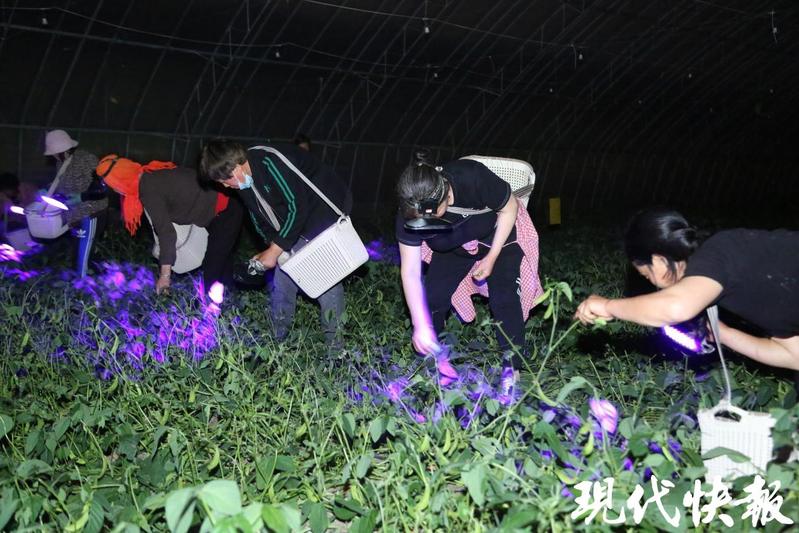 “搜尋時一定要仔細,左右兩邊都得留意,才能把豆丹抓全。”單體2號大棚的豆丹養殖負責人李加祥一邊熟練地捕捉豆丹,一邊向工作人員傳授經驗,“豆丹和豆葉顏色相近,白天捕捉極易遺漏。但到了夜間,紫光燈一照,豆丹就像會發光的螢火蟲,清晰可見,不僅抓捕效率高,還能做到顆粒歸倉?!睘榇_保此次捕捉行動順利開展,園區提前規劃,從人員調配到工具準備,每一個環節都精心部署,為高效捕捉打下堅實基礎。