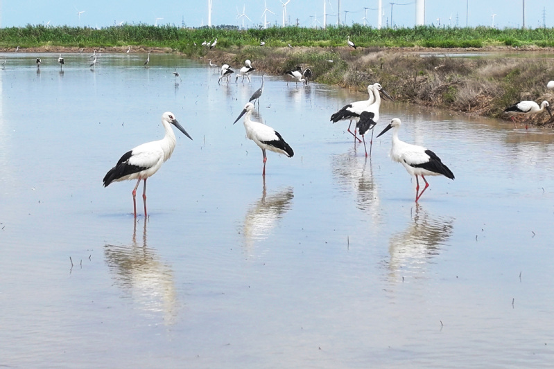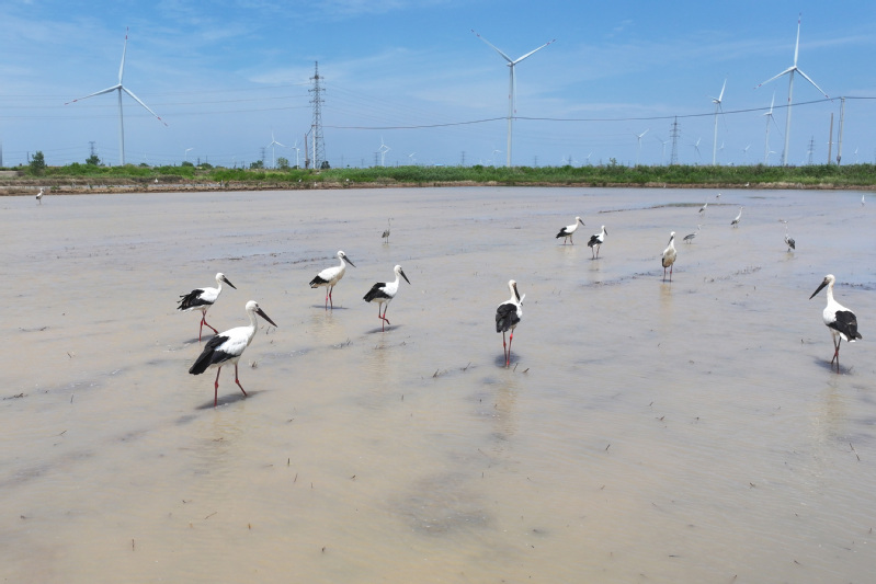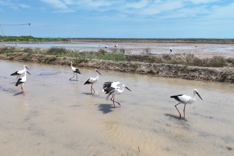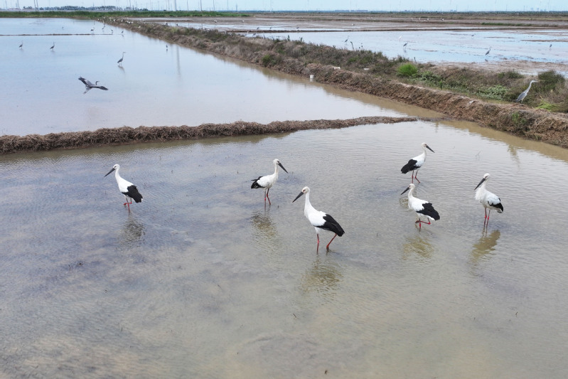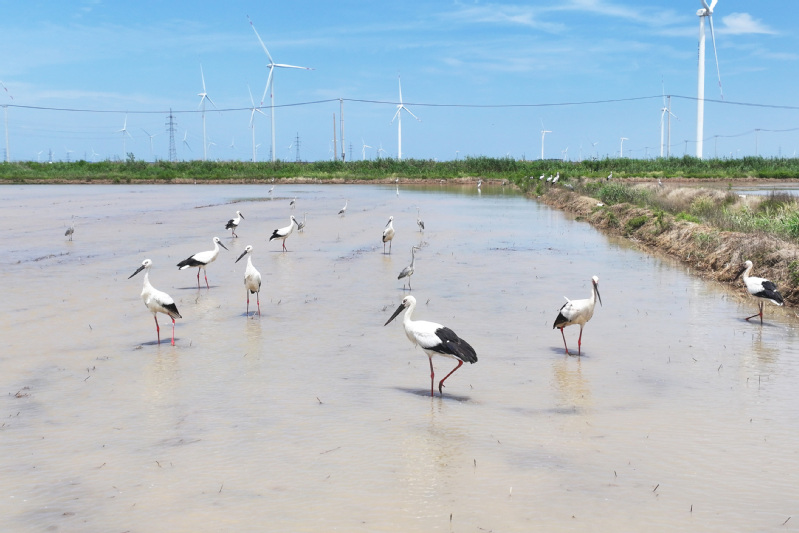 6月23日,江蘇省鹽城市射陽縣臨海農場順泰生產區的水田里,50余只國家一級保護動物東方白鸛姿態優雅,正悠然漫步、覓食,與水田的碧波相互映襯,構成一幅靈動的生態畫卷。