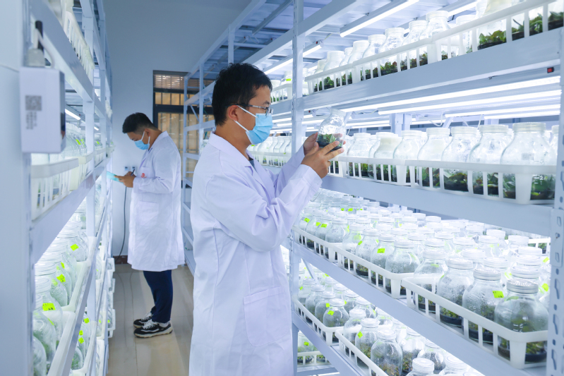 在江蘇農(nóng)墾云臺(tái)農(nóng)場(chǎng)的蝴蝶蘭培養(yǎng)室里,培養(yǎng)架上排列著一瓶瓶嫩綠的幼苗。通過(guò)精準(zhǔn)調(diào)控光照波長(zhǎng)、濕度梯度和營(yíng)養(yǎng)配方,不僅可以縮短蝴蝶蘭育苗周期,還能顯著提高苗子的成活率和抗病性。圖為技術(shù)人員在開展日常蝴蝶蘭幼苗培育觀測(cè)工作,并同步系統(tǒng)記錄生長(zhǎng)數(shù)據(jù)及環(huán)境調(diào)控參數(shù)。