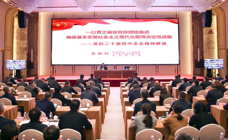 按照省委統一部署,11月19日,學習貫徹黨的二十屆四中全會精神省委宣講團報告會在江蘇農墾舉行。省委宣講團成員、省社科聯黨組書記、常務副主席張新科作宣講報告。集團黨委副書記、總經理姜建友主持報告會。報告會上,張新科圍繞學習貫徹習近平總書記在黨的二十屆四中全會上的重要講話精神和全會《建議》,從深刻認識黨的二十屆四中全會的重大意義,準確把握“十五五”時期在基本實現社會主義現代化進程中的重要地位,全面理解“十五五”時期經濟社會發展的戰略任務和重大舉措等方面,結合我國經濟社會發展實際情況,運用生動案例和翔實數據,進行了系統闡釋和全面解讀。他指出,全會取得的重大成果、作出的重大部署,充分體現了以習近平同志為核心的黨中央團結帶領全黨全國各族人民續寫經濟快速發展和社會長期穩定兩大奇跡新篇章、奮力開創中國式現代化建設新局面的歷史主動,必將對黨和國家事業發展產生重大而深遠的影響。要把學習貫徹全會精神同學習領會習近平新時代中國特色社會主義思想貫通起來,結合習近平總書記對江蘇工作重要講話精神,做到學深悟透、狠抓落實,奮力譜寫“強富美高”新江蘇現代化建設新篇章。姜建友在主持報告會時指出,學習好、宣傳好、貫徹好黨