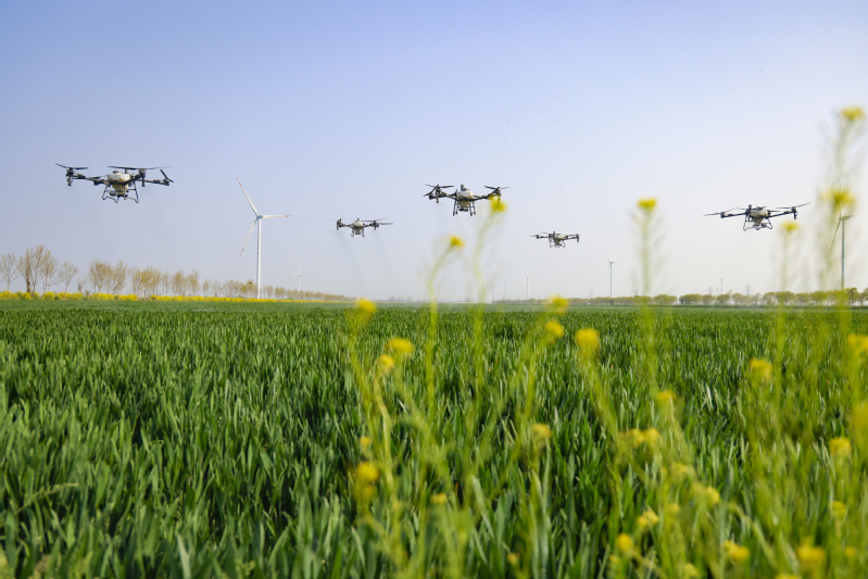 在蘇墾農發新洋分公司新北生產區高標準農田,五臺滿載生物藥劑的北斗導航植保無人機正沿著預設航線精準噴灑葉面肥,多光譜測繪無人機同步監測苗情長勢,全力守護麥田健康。新洋分公司將綠色防控與統防統治有機結合,所有基層一線青年員工全部掌握無人機操作技術,實現了近6萬畝農田的飛防作業全覆蓋。目前,共引入更新大疆T70、T100等新型無人機23臺。