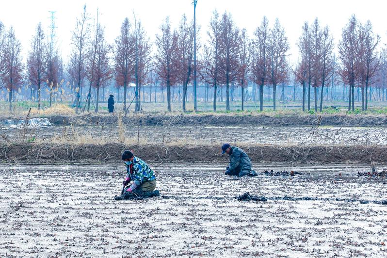 3月14日,云臺農場云水灣濕地公園水生花卉種植基地內,工作人員正在采挖睡蓮苗,運往沭陽供應市場。冬日閑田化生“致富田”,帶來富貴“蓮蓮”。